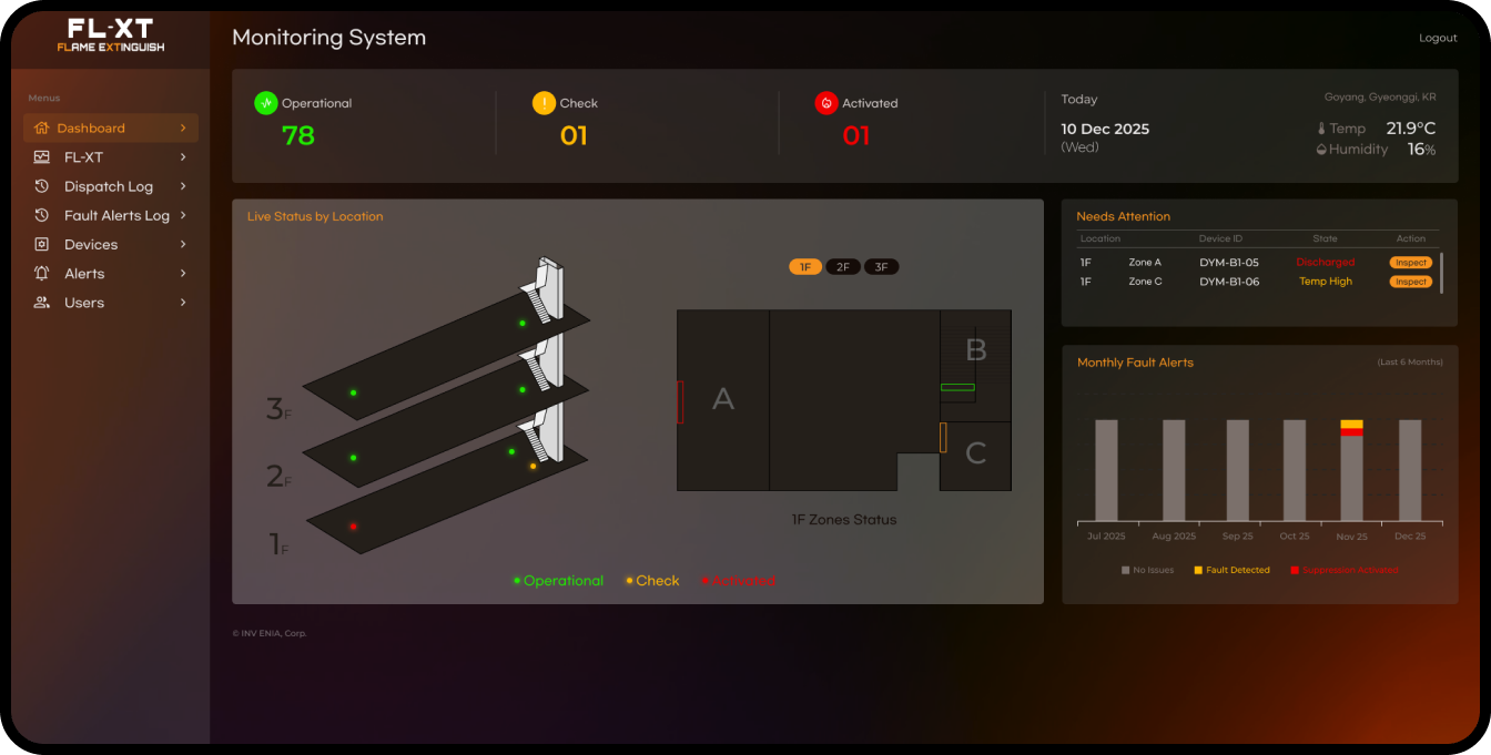 The FL-XT automatic fire suppression system provides real-time monitoring of fire incidents and system anomalies. Upon detecting any irregularities, it promptly sends out alerts via system displays, SMS, WhatsApp, Messenger, email.
